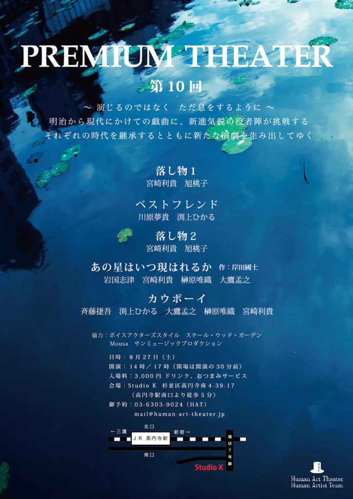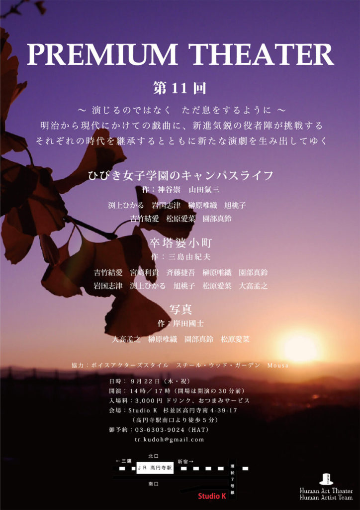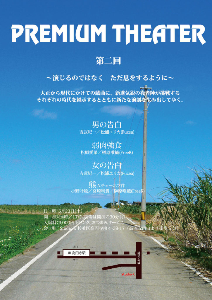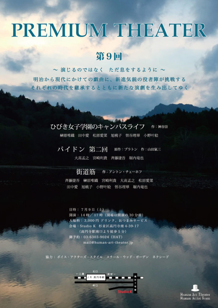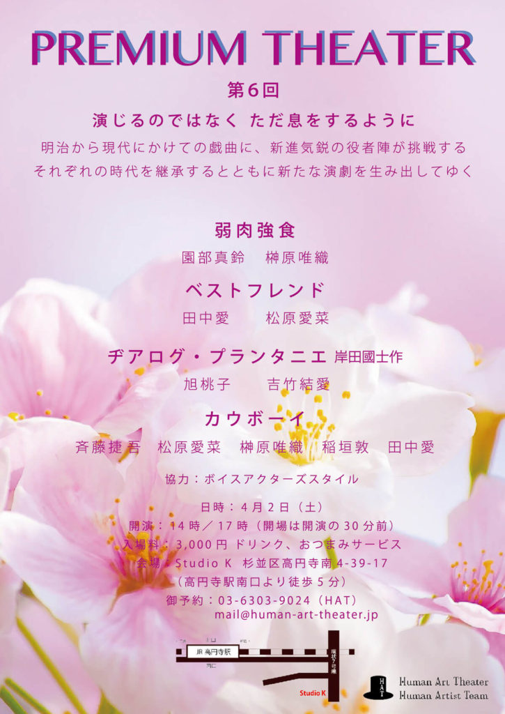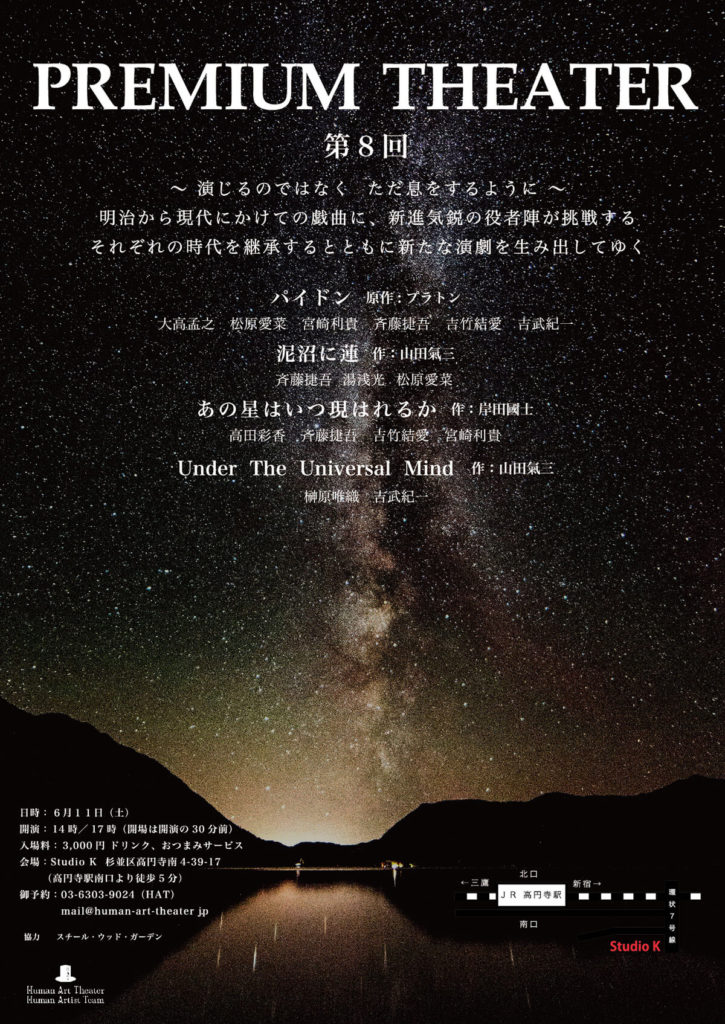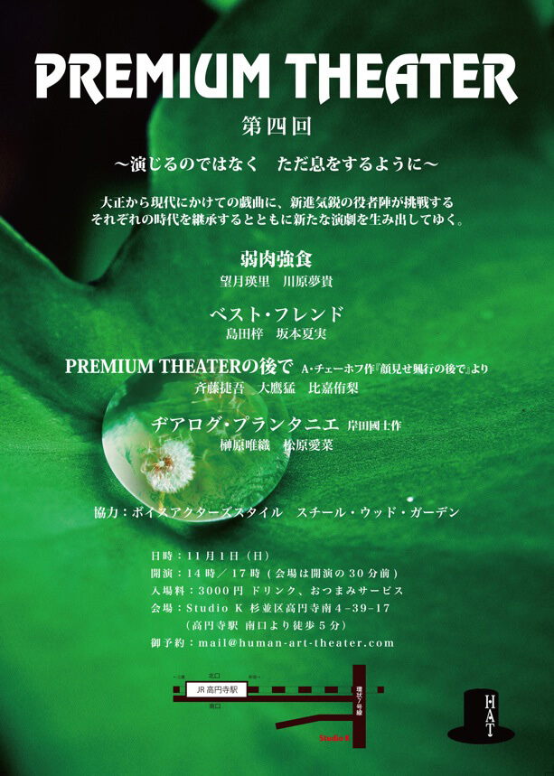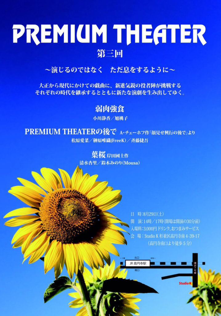 A・チェーホフ 、岸田國士、ジョン・ P・シャンリィなどの優れた世界中の短編戯曲から厳選された100作品を飲食しながら観る『PREMIUM THEATER』は、前身の『WEEKEND THEATER』から数えて200回以上を企画上演。百の練習より一の本番。