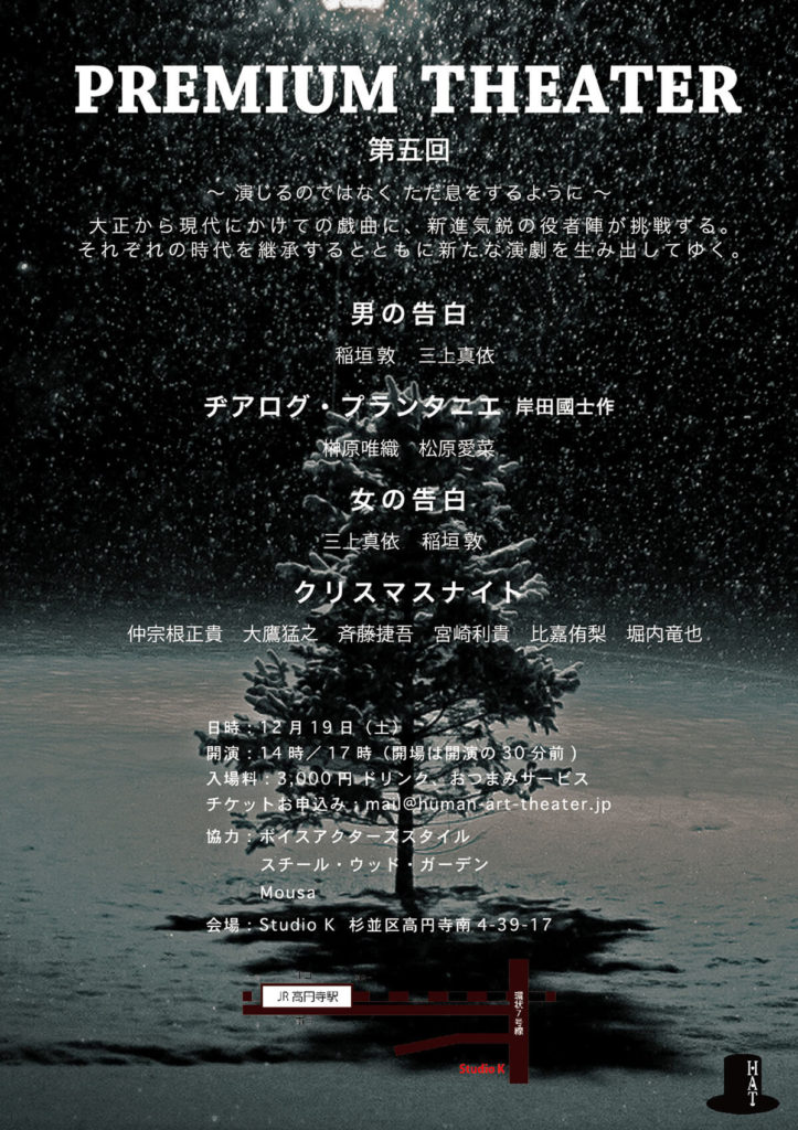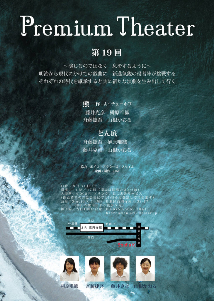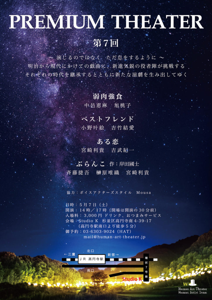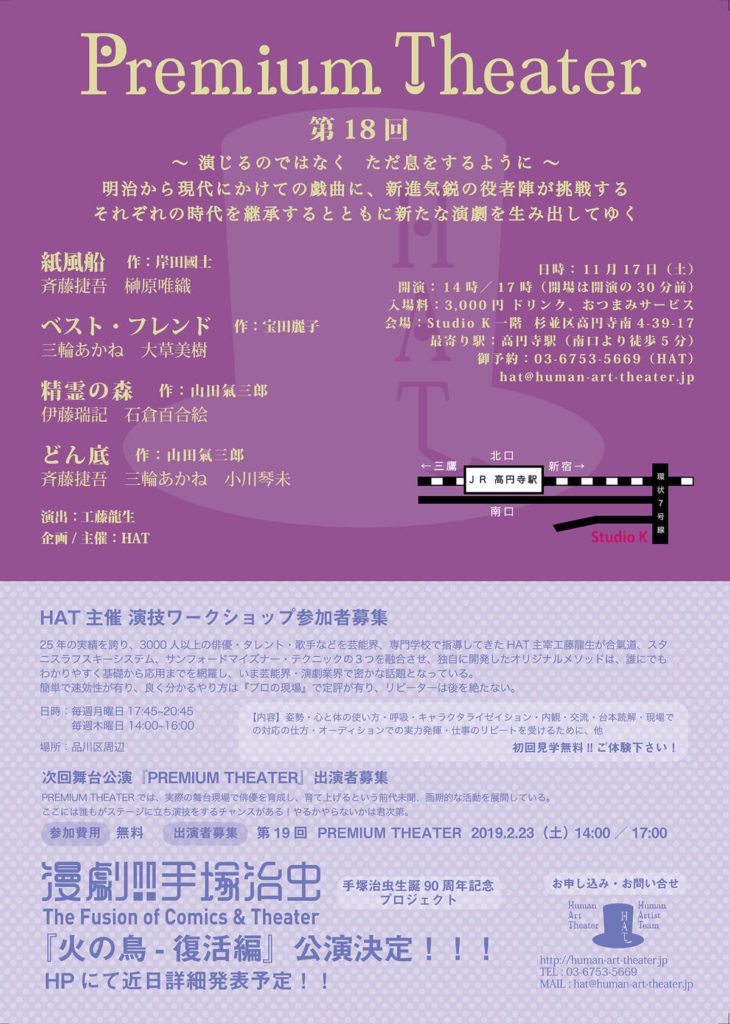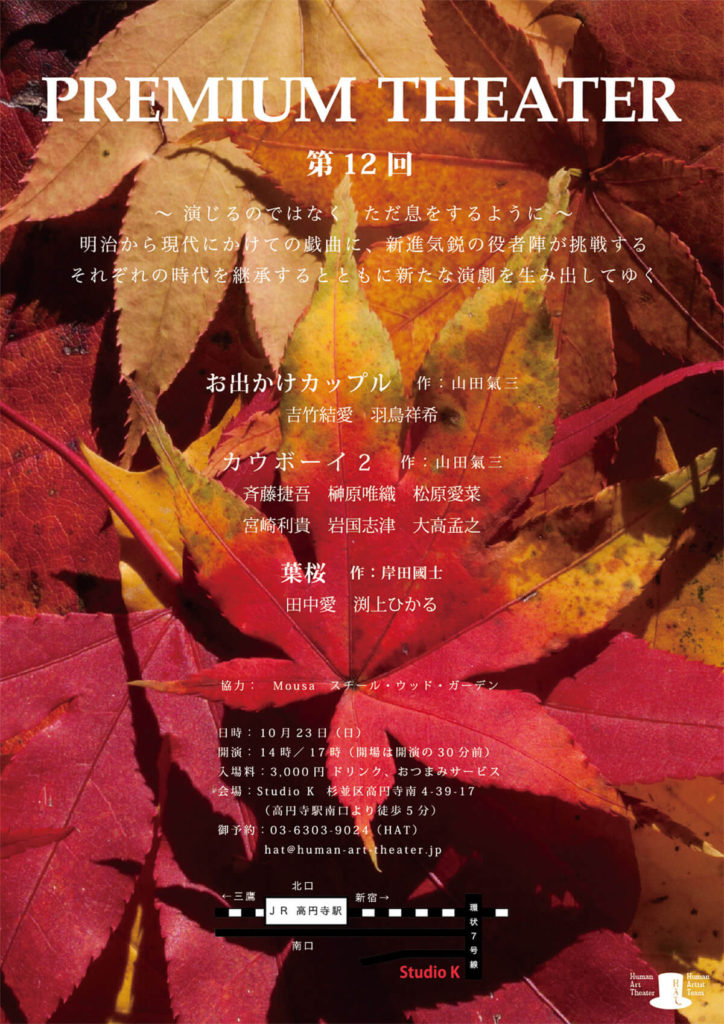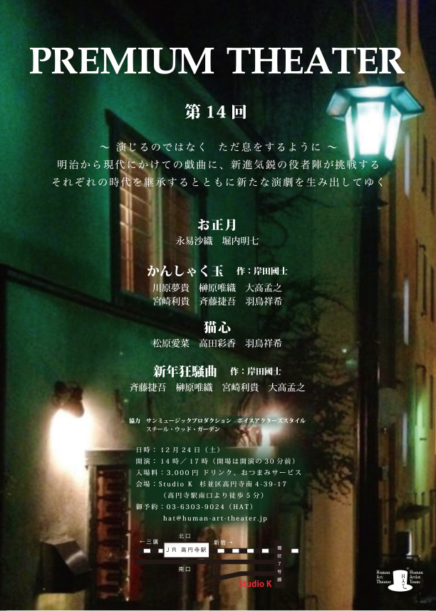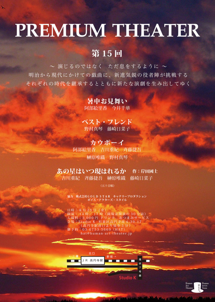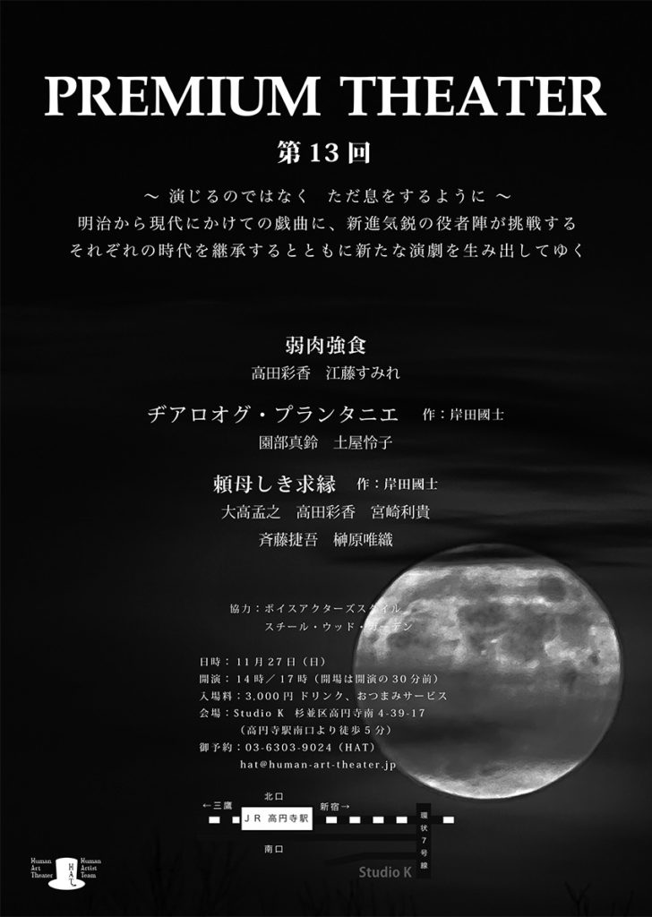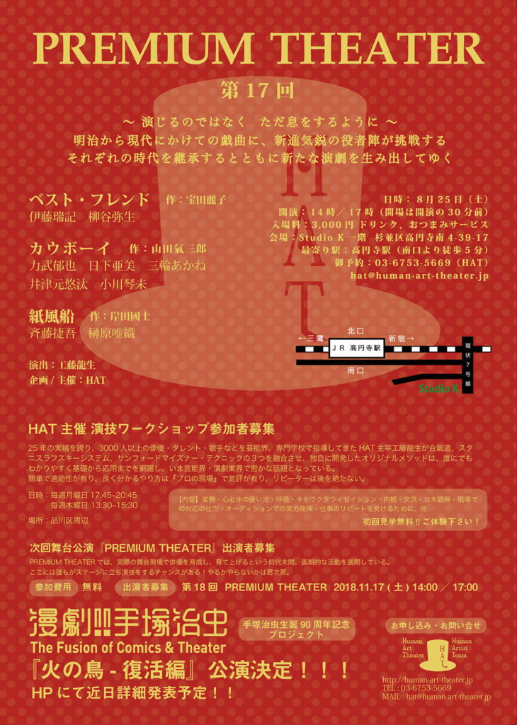 A・チェーホフ 、岸田國士、ジョン・ P・シャンリィなどの優れた世界中の短編戯曲から厳選された100作品を飲食しながら観る『PREMIUM THEATER』は、前身の『WEEKEND THEATER』から数えて200回以上を企画上演。百の練習より一の本番。