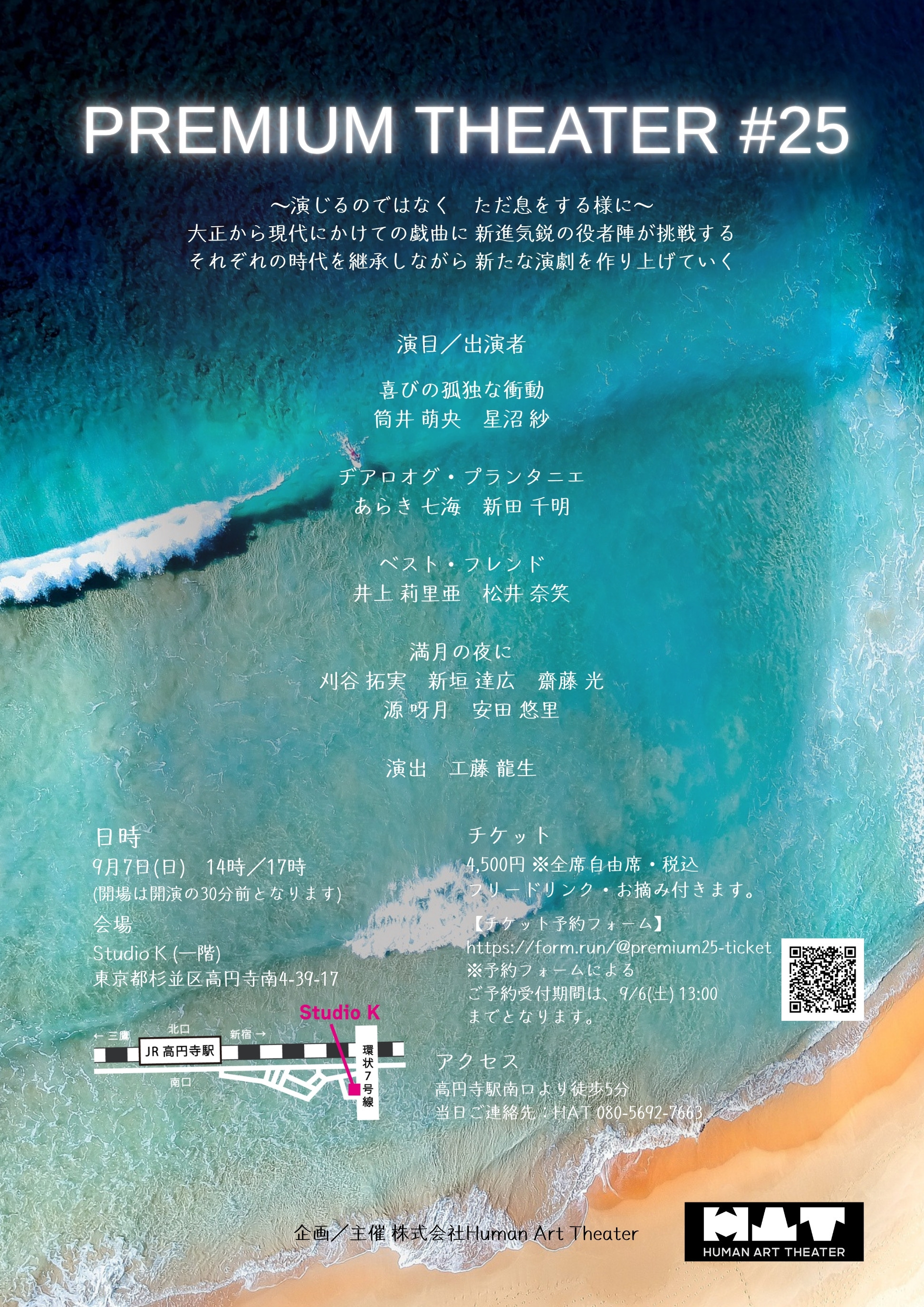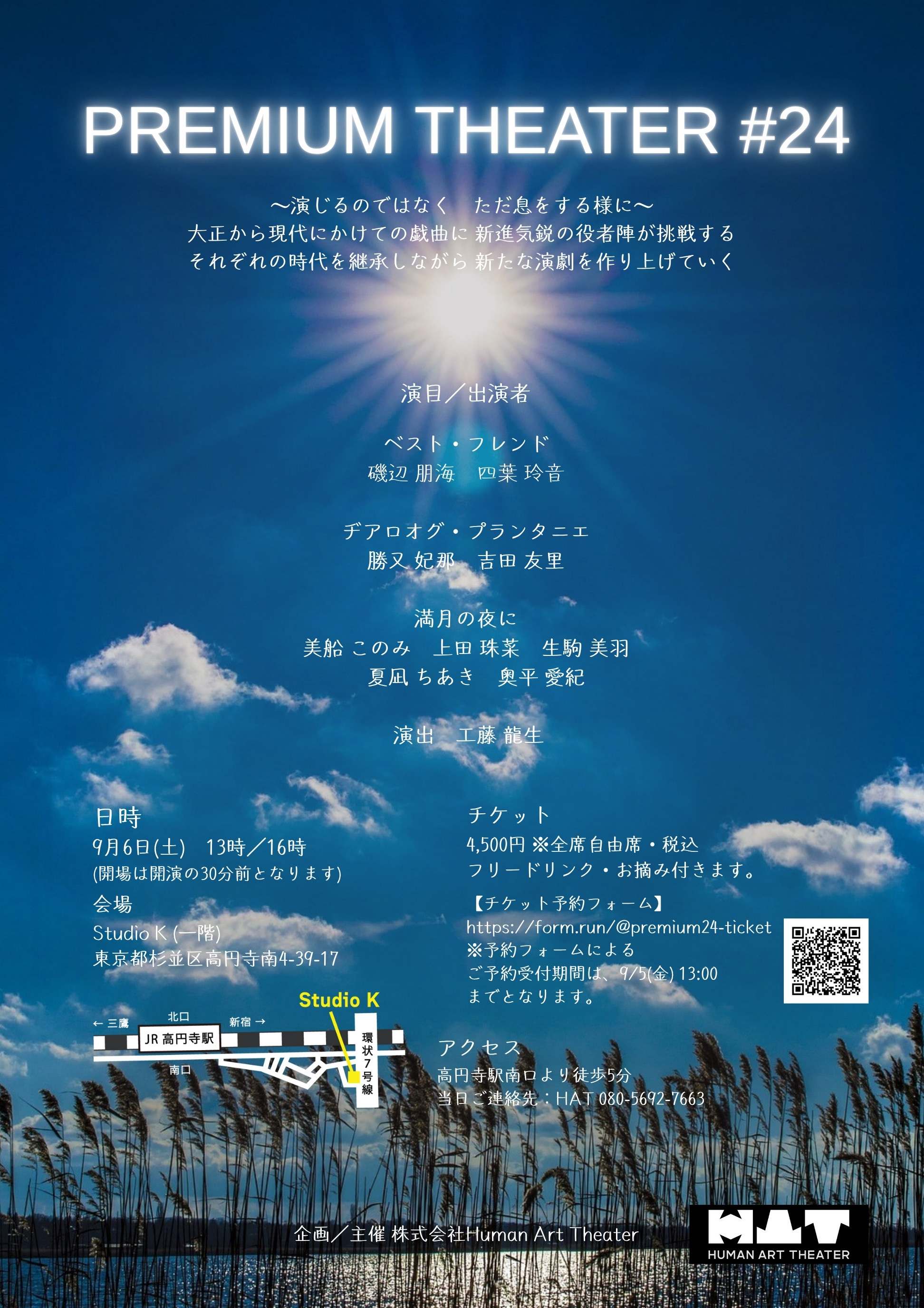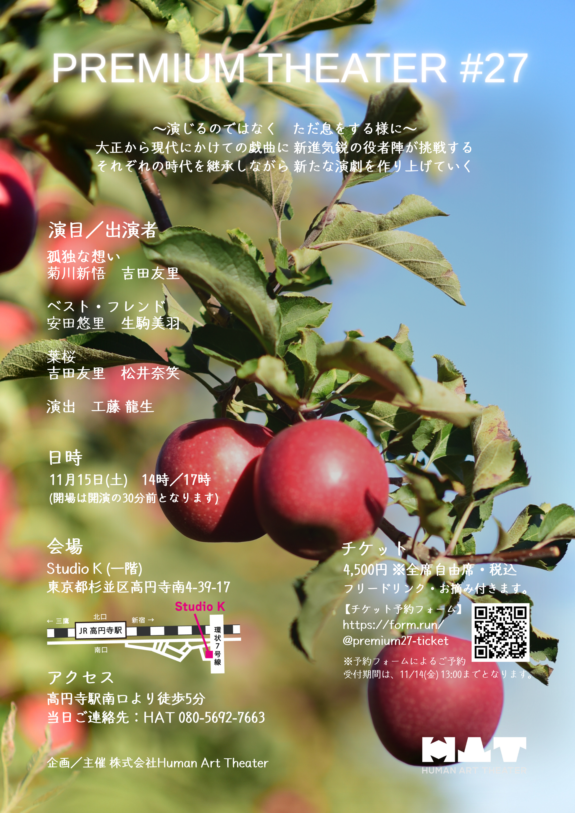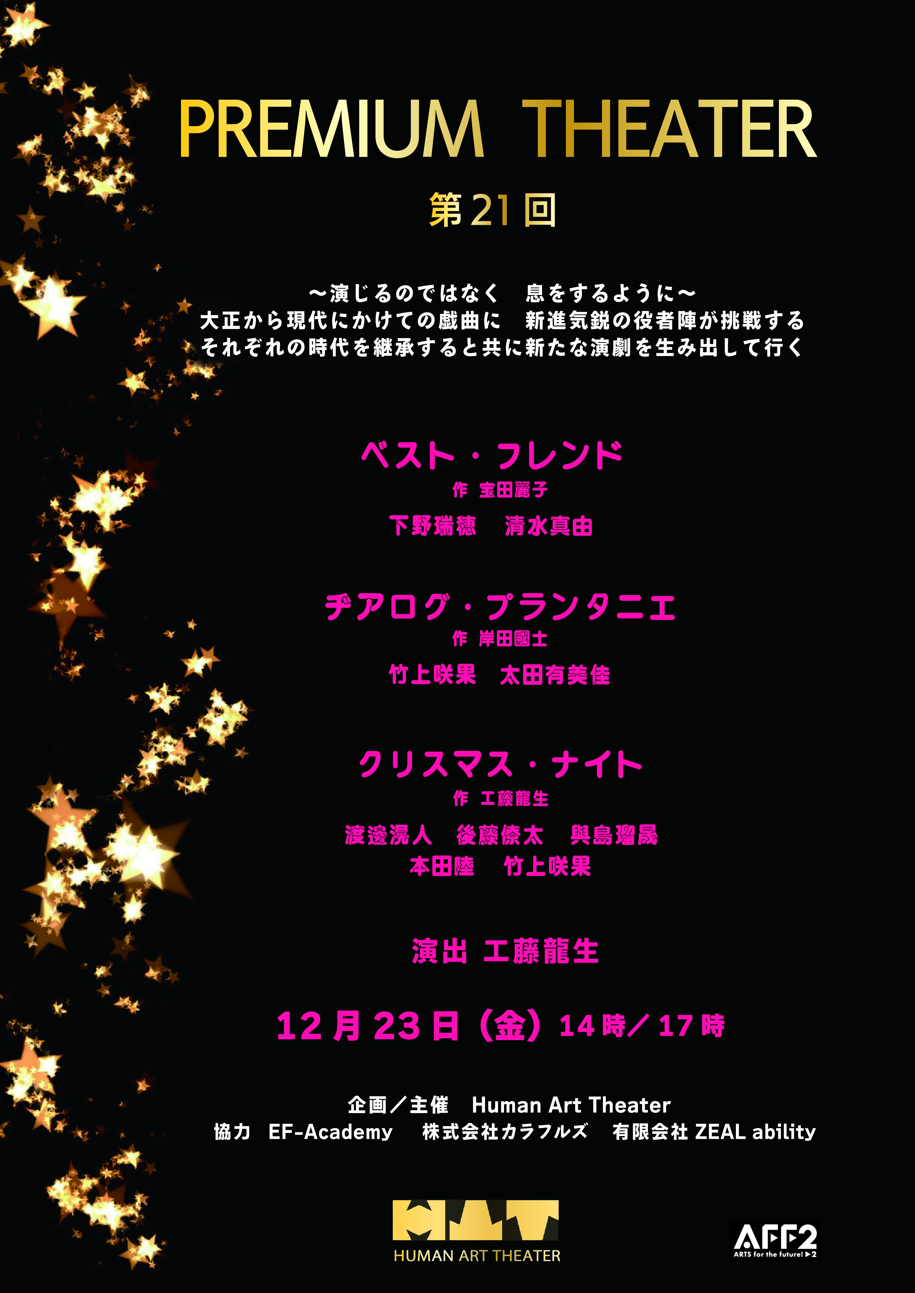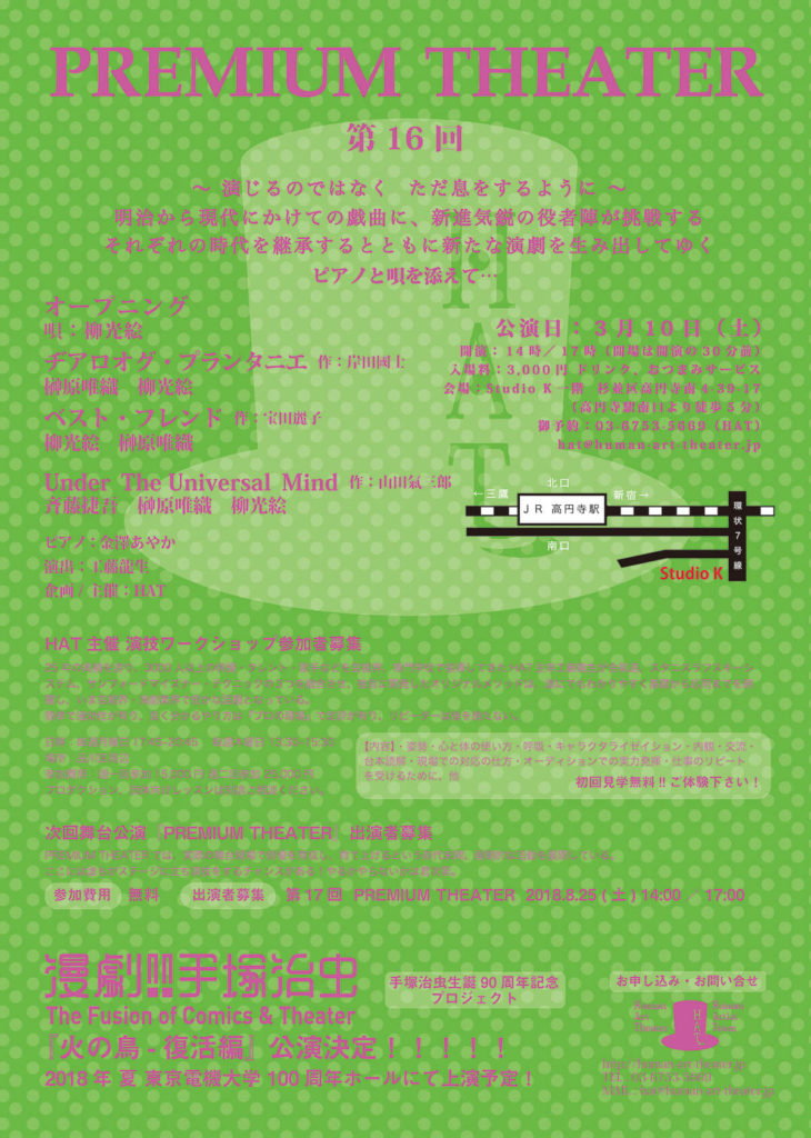 A・チェーホフ 、岸田國士、ジョン・ P・シャンリィなどの優れた世界中の短編戯曲から厳選された100作品を飲食しながら観る『PREMIUM THEATER』は、前身の『WEEKEND THEATER』から数えて200回以上を企画上演。百の練習より一の本番。